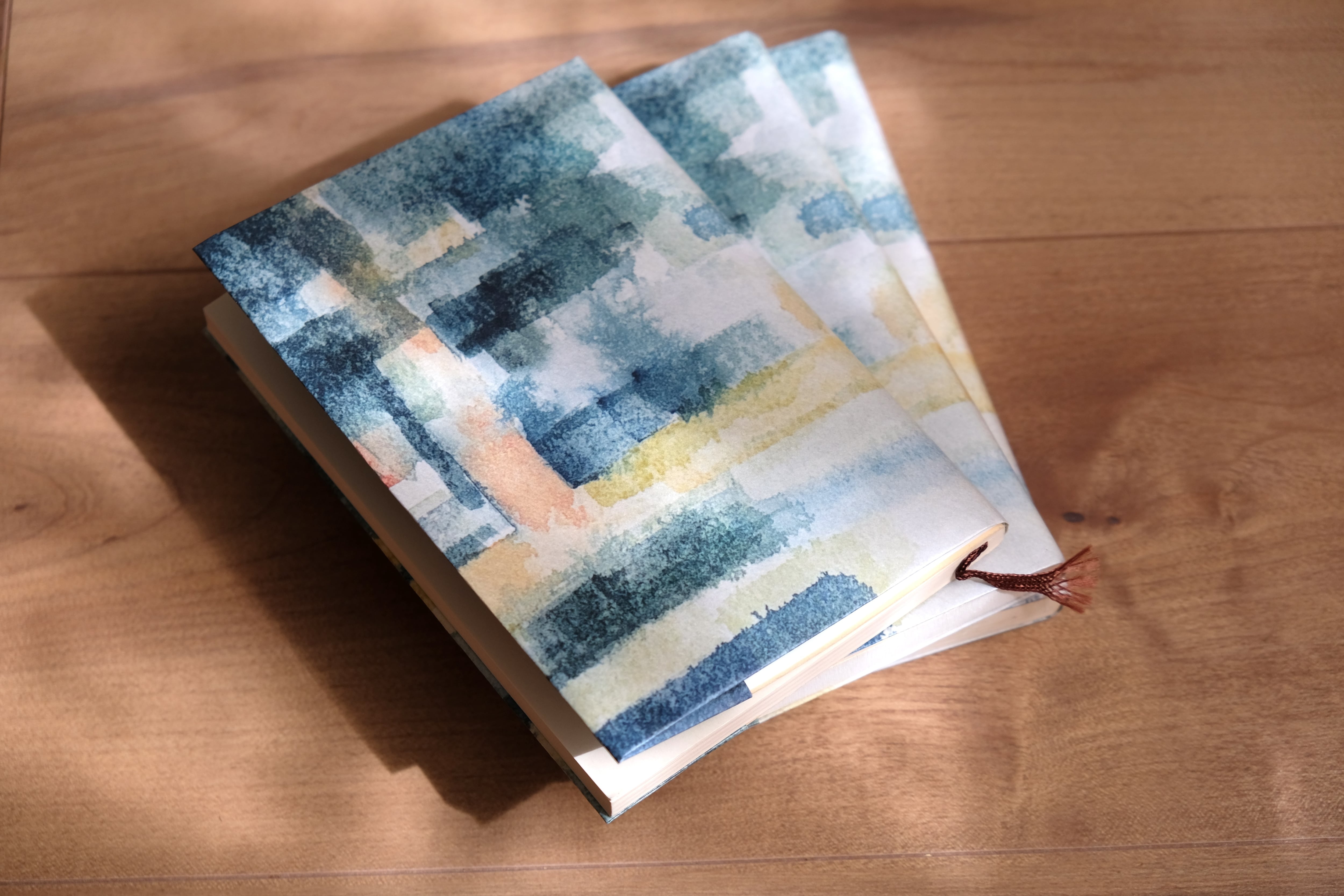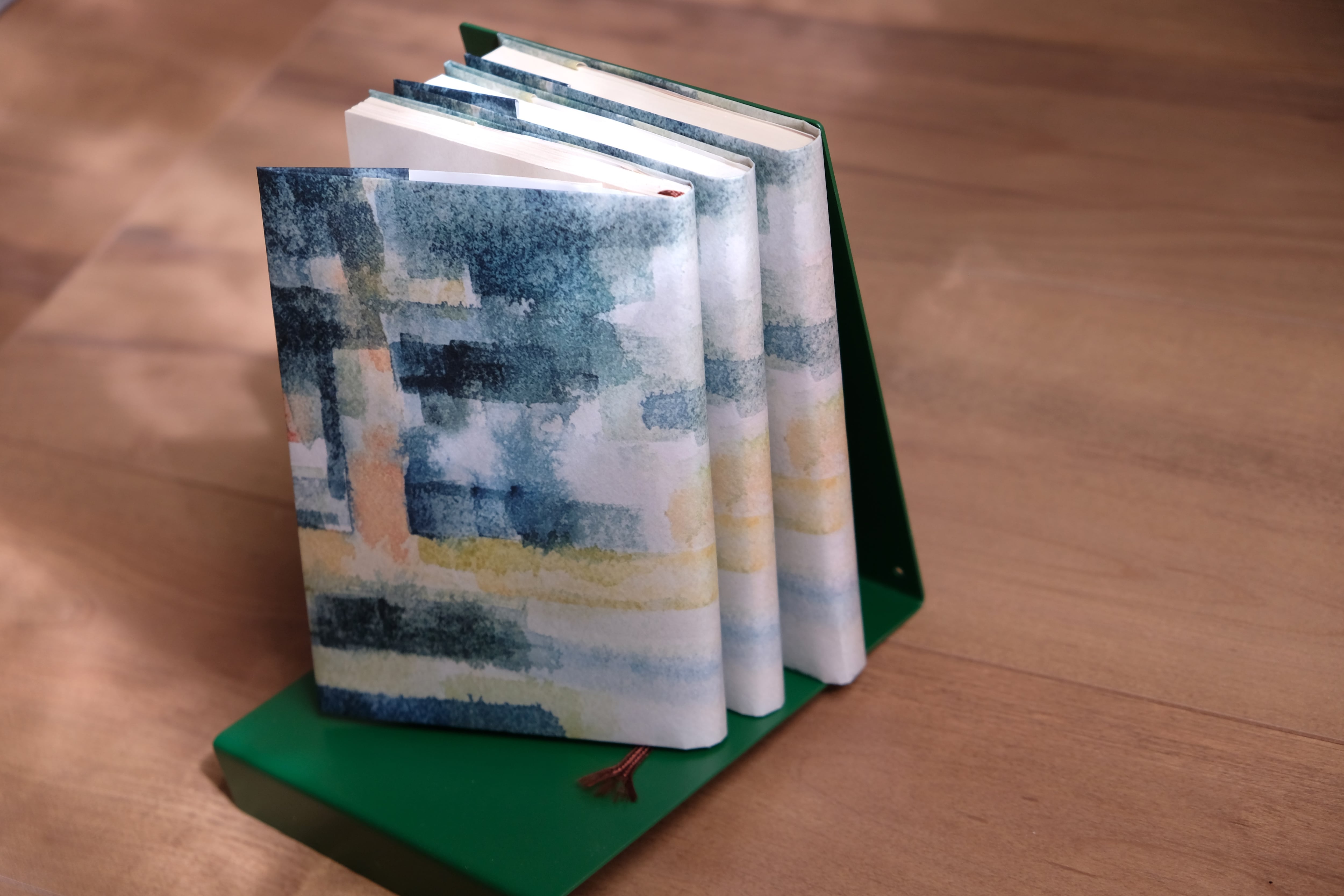 水彩で描いた抽象風景画をプリントした紙製のブックカバーです。